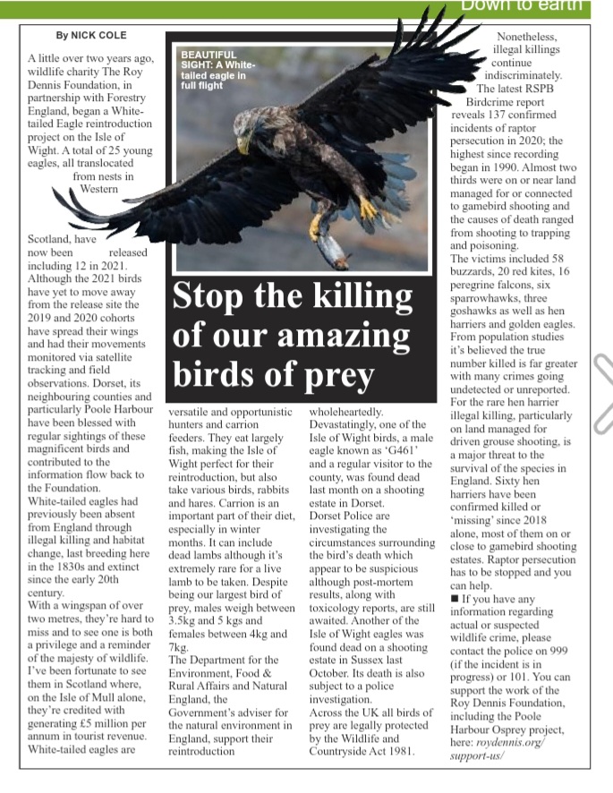 Devastatingly, one of the Isle of Wight birds, a male eagle known as “G461” and a regular visitor to the county, was found dead last month on a shooting estate in Dorset. Dorset Police is investigating the circumstances surrounding the bird’s death which appear to be suspicious although post-mortem results, along with toxicology reports, are still awaited. Another of the Isle of Wight eagles was found dead on a shooting estate in Sussex last October. Its death is also subject to an ongoing police investigation.