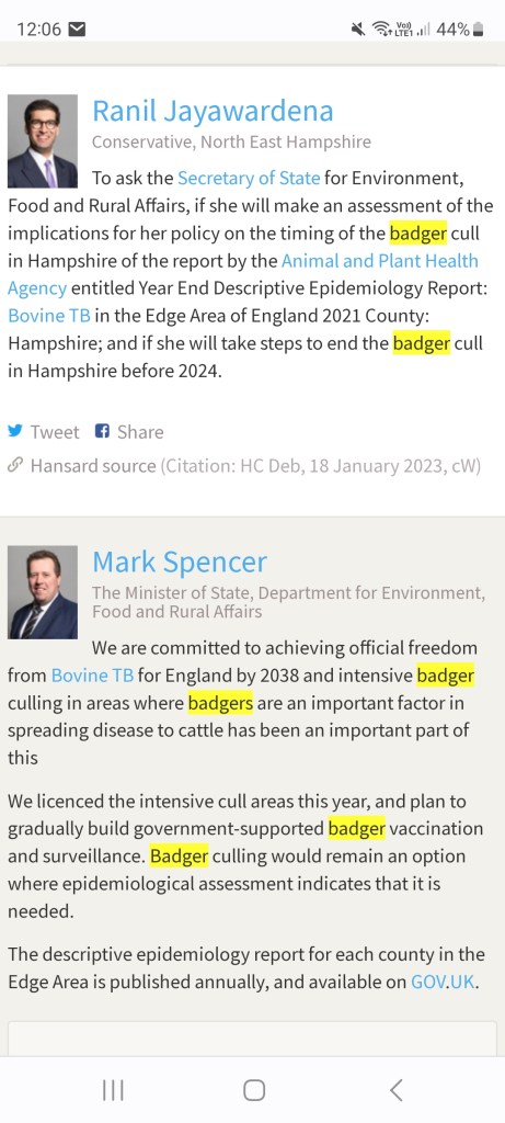 Former Secretary of State for the Environment challenging his successor to consider an early end to the Hampshire badger cull based on the content of the most recent APHA Year-End Descriptive Epidemiology Report for the county which contains not a shred of confirmed evidence of bTB reservoirs in badgers here OR evidence of wildlife as a source of herd infections. Mark Spencer’s reply is typically ignorant and dismissive, completely ignores the basis of the question and avoids answering it. We’ll now apply even more pressure to Spencer, Richard Benyon, Defra and Ranil Jayawardena alongside our friends at Badger Trust and Hampshire & Isle of Wight Wildlife Trust.
